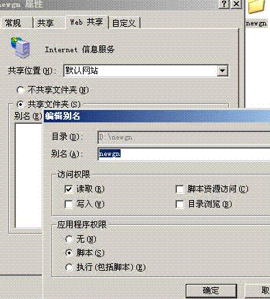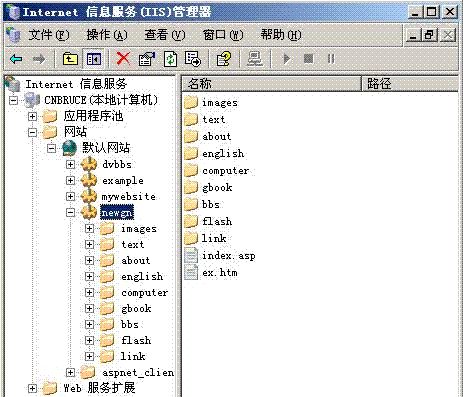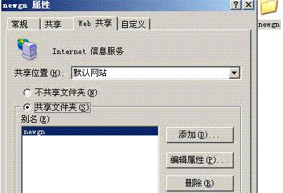 4,補充說明。其實設置Web共享就是設置IIS的虛擬目錄。你可以查看到IIS中默認網站中已經有了newgn(附注:偶的OS是win2003的,其實有關IIS的操作一回事。如: win2K裡面打開IIS---本地計算機---默認站點)