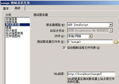 8,再接著“測試服務器”,“服務器模型”暫為ASP Javascript,“訪問”本地/網絡,“測試服務器文件夾”仍是我們的站點文件夾d:\newgn\,“URL前綴”在http://localhost後面添加“newgn/”,添加的東西就是我們步驟3中設置的虛擬目錄