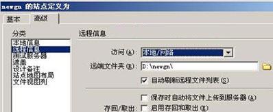 7,然後設置遠程信息,訪問選擇“本地/網絡”,遠端文件夾仍選擇我們的站點文件夾d:\newgn\