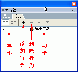在Dreamwaever中,對行為的添加和控制主要通過“行為”面板來實現。選擇窗口>行為命令,打開行為面板,下圖所示。