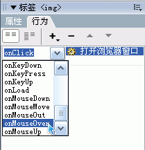 (3)、當我們添加行為時,系統自動為我們選擇了事件onClick(單擊鼠標),現在,我們單擊行為面板上的事件菜單按鈕,打開事件菜單,重新選擇一個觸發行為的事件。把onClick(單擊鼠標)的事件改為onMouseOver(鼠標滑過),如下圖所示: