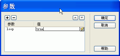 要實現循環播放音樂的效果,單擊屬性面板中的“參數”按鈕,然後單擊“+”按鈕,在“參數”列中輸入loop,並在“值”列中輸入true後,單擊“確定”按鈕。