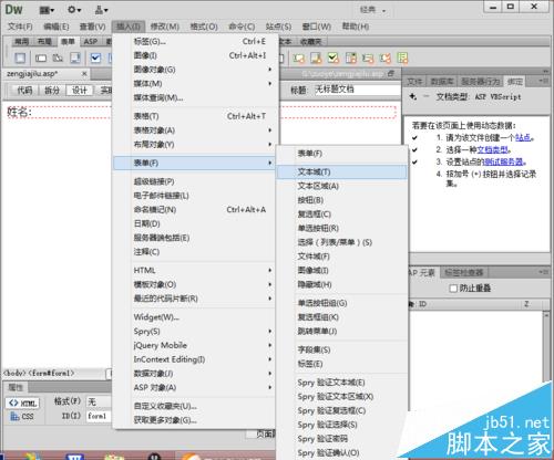 5、把鼠標指針放在表單內,輸入“姓名:”,然後點擊菜單欄:插入-->表單-->文本域。操作如圖。