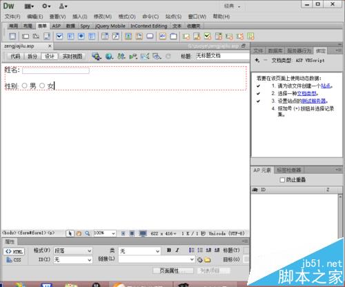 7、把鼠標指針放在剛剛添加的文本域內,按回車,輸入“性別:”,然後點擊菜單欄:插入-->表單-->單選按鈕,然後再單選按鈕後邊添加文字“男”。