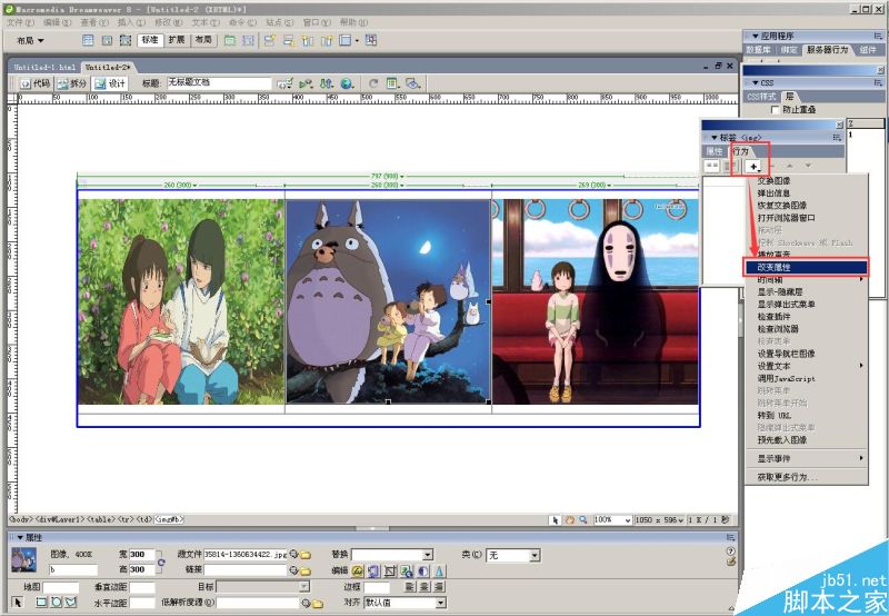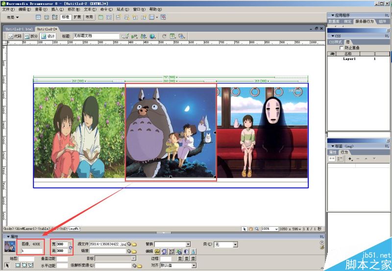 3、然後在3列表格中分別插入圖像,每張圖像大小設置“寬300px,高300px”;圖像名稱從左到右依次設置為“a、b、c”;