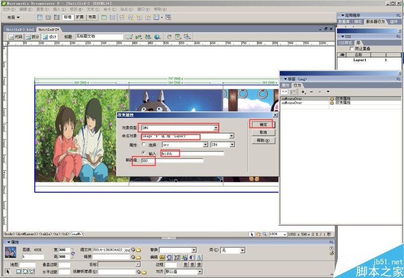 6、將觸發行為修改為onmouseover,也就是鼠標放到圖片上面的時候,就會將圖片的寬度改為600;
