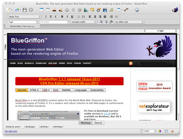 BlueGriffon是一款所見即所得的Web內容編輯器。它是基於Gecko——火狐浏覽器的HTML渲染引擎開發的,使用它,你可以開發出標准的Web頁面。它可以運行在的Windows、Linux以及蘋果系統上。