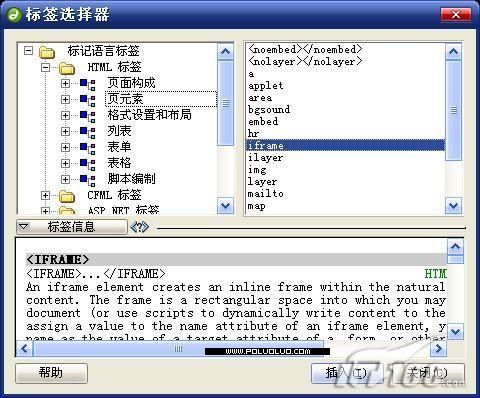 點擊菜單“插入”→“標簽”,進入“標簽選擇器”。鼠標在左側標簽分類列表中依次選擇“標記語言標簽”→“HTML標簽”→“頁元素”,在右側標簽列表中選擇“iframe”,點擊“插入”按鈕完成,如圖1。