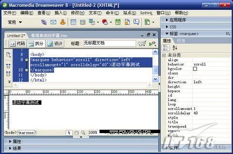 我們上面說過了“標簽檢查器”可以作為“標簽編輯器”的有益補充,例如我們制作滾動字幕經常用到的“marquee”標簽,我們使用“標簽編輯器”插入“marquee”標簽,系統並不會如“iframe”標簽那樣提供可視化的參數設置界面,僅僅在代碼中插入簡單的代碼“<marquee></marquee>”,呵呵,令人抓狂吧。其實不必擔心,現在“標簽檢查器”就派上用場了,選中“marquee”標簽後,“標簽檢查器”會提供詳細的設置參數供選擇,如圖4。