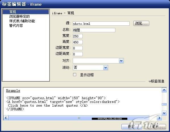 系統會自動轉入“標簽編輯器”,接下來,忘記煩人的手工書寫代碼吧,你要做的就是根據提示填寫所需的iframe參數。如果你對於某些選項還不是非常熟悉,可以點擊對話框下的“標簽信息”,軟件內容詳盡的標簽幫助應該可以給你權威的解釋,如圖2。