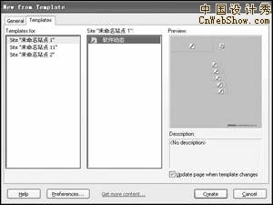 有了模板之後,接下來就要在編輯網頁時候使用它們了。只要在Dreamweaver MX 2004主窗口中運行“File→New”命令即可看見圖1所示的新建窗口,接著進入“Templates”標簽即可查看到已經保存的模板,從中選取一種還可以在右部的預覽區進行預覽(圖3),最後挑選一款中意的模板並點擊下部“Create”按鈕打開這個模板。
