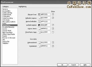 在打開的模板中,無法編輯的區域將呈高亮狀態顯示,但是有些位置是鎖定區域,卻不是高亮顯示,這主要是因為圖片正好蓋住了背景的顏色。對於這種情況,可以運行“Edit→Preferences”命令,在彈出窗口的“Category”列表中選取“Highlighting”一項,接著在右部區域中選取“Locked regions”旁邊的“Show”選項(圖4),並且設定高亮顯示色為藍色,這樣就可以很清楚地分辨出模板中的鎖定區域了。