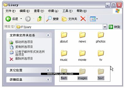 在文件夾【Liury】中建立子文件夾【about】、【news】、【photos】分別對應欄目“私花園”、“新聞台”、“照相館”;建立子文件夾【music】、【movie】、【tv】分別對應欄目“歌友會”、“影迷城”、“電視劇場”。