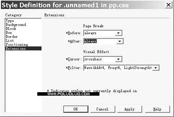 2、在隨即出現的樣式定義設置對話框中,選擇Category列表框中的最後一項“Extensions”選項(如圖2),打開擴展窗口參數設置窗口,其中“Page Break”選項用於設置樣式應用前後的位置,可以不予設置,而“Visual Effect”下的“Cursor”則用於自定義鼠標指針形狀,“Filter”用於選擇效果的類型,共有16個選項。用戶選擇好效果類型以後,將其中有問號的地方改成自己希望的參數,點擊“OK”即完成樣式的定義。