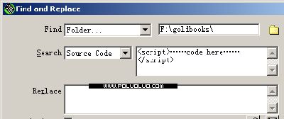 懂Html的人都知道,廣告條在Html中就是腳本(Script)。黃金書屋是按目錄的形式層層安排文章的。在Find選項中選擇所在文件夾,在Search選項中選擇處理對象為source。再將表示廣告條的腳本源碼拷貝到Search框中,Replace框為空白,如圖2: