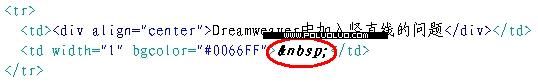 這是什麼原因呢?於是筆者打開Dreamweaver的源代碼窗口,經過仔細觀察,發現設置為1像素寬的單元格中有個“ ”的標記(如圖2),這個標記是HTML中的轉義符,在浏覽器輸出為一個空格。發現這個標記,筆者終於恍然大悟,原來就是這個標記在作祟!於是刪除這個標記後,再次打開網頁,豎直細線條終於成功的設置了!