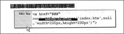 11. 可以通過為該鏈接應用Open Browser Window行為來設置單擊鏈接時打開Index.html窗口,不過更方便的方法是利用快速標識編輯器。方法是首先將插入點放置到鏈接中,然後在狀態欄左端的標識選擇器上,單擊標識按鈕,選中整個鏈接。然後按下Ctrl+T組合鍵,打開快速標記編輯器,進入到快速標記編輯器的 編輯標識模式。再在“>”前輸入“onclick="window.open('index.html',null','width=200px,height=200px')"”(如圖4所示)。設置完畢,按下回車鍵,確認操作。