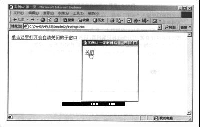 本例中制作了兩個頁面,如圖1所示, Index.html是顯示於子窗口中的頁面,而在名為firstpage.html的頁面中,包含在子窗口中打開Index.html的鏈接。單擊鏈接時,將在子窗口中打開index.html。可以直接單擊子窗口中的“關閉”鏈接關閉子窗口,也可以不去理睬它,在15秒之後,子窗口也會自動關閉。
