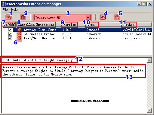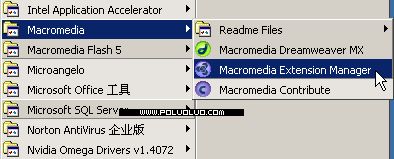 第一步,確定你安裝有Macromedia Extension Manager(以下簡稱EM),中文名稱就叫插件管理器,Dreamweaver 4.0以上版本都自帶了這個軟件,在安裝Dreamweaver的時候會自動安裝這個東東。如下圖所示: