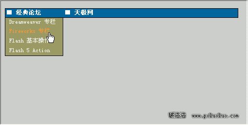 因此,我們可以分四步來制作下拉菜單,首先我們需要一個導航條,它用來放置首先出現在浏覽者眼前的主菜單;然後再制作開始隱藏著而將會出現的下拉選單;接著,進行最關鍵的一步,為主菜單和下拉選單添加上隱藏和顯示層的效果;最後,我們進行菜單的美化修飾。最終看到的效果如圖。