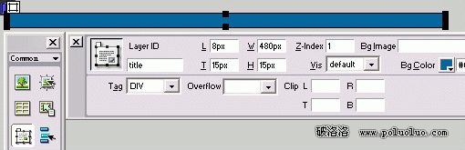 按CTRL+F2打開Objects面板,點擊層按鈕後在頁面中按住鼠標不放拖出一個層,然後在層的Properties(屬性)面板中設置各參數,Layer ID框填入title,L、T、W、H框分別填入8、15、480、15,背景色填入#006699,如圖。
