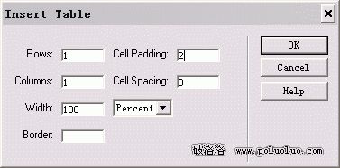 將光標移至層內,點擊Objects面板上的表格按鈕,插入一個一行四列的表格,設置如圖。