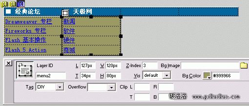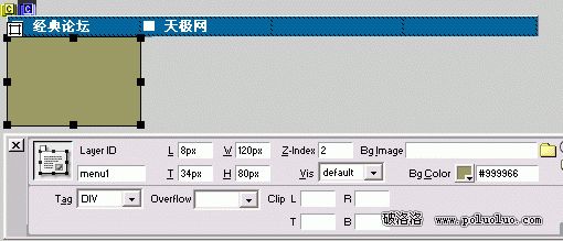 再次從Objects面板插入一個層到前面我們做好的導航條的下方,各項參數填為:Layer ID框填入menu1,L、T、W、H框分別填入8、34、120、80,背景色填入#999966,其中L和T兩個參數是設置這個層距離窗口左邊框和上邊框的距離,一定不能填錯,不然菜單將會錯位,也將影響完成後的可用性。