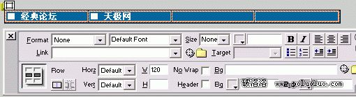 按住CTRL鍵不放點取表格的四個單元格,然後設置它們的寬度為120,並在前兩個單元格中輸入文字,就是你的主菜單名,可按自己想要的名字輸入,我用"經典論壇"和"天極網"為例,並加上鏈接。