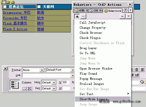 首先按CTRL鍵不放點擊導航條中的第一個單元格,現按Shift+F3打開Behaviors窗口,點按鈕,在下拉選項中選中"Show-Hide Layers"(如圖)。如果選項中沒有這一項,則選擇Show Events For下的IE 5.0後,重新點 按鈕,此時"Show-Hide Layers"將出現。