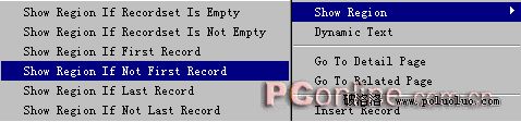 (1)大家先選中“首頁”,然後點擊Application面板中的Server Behaviors標簽,按加號按鈕,將鼠標滑到Show Region選項,顯示出下拉菜單,如圖20。