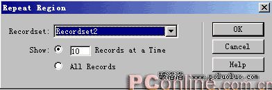 圖16 5、選中表格中的第二行,點擊Application面板中的Server Behaviors標簽,按加號按鈕,選擇Repeat Region,彈出Repeat Region對話框,因為要分頁顯示,所以選擇每次顯示幾條,在這裡我輸入的是10,意思為每頁顯示10條記錄,大家可以根據情況自由輸入,如圖17。點擊ok鍵回到頁面。