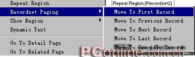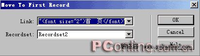 圖17 6、因為是分頁顯示,需要翻頁,那麼在dw裡如何實現呢?很簡單,大家先選中“首頁”,然後點擊Application面板中的Server Behaviors標簽,按加號按鈕,可以看到有一個Recordset Paging選項,將鼠標滑到這選項,顯示出下拉菜單,這些菜單的含義我想大家應該明白了吧,如圖18。選擇第一條“Move To First Record”,彈出對話框,如圖19,點擊ok按鈕回到頁面,這樣“首頁”的動態鏈接就做好了,其他的“上一頁”、“下一頁”、“末頁”依次類推,做好與其相對應的動態鏈接。