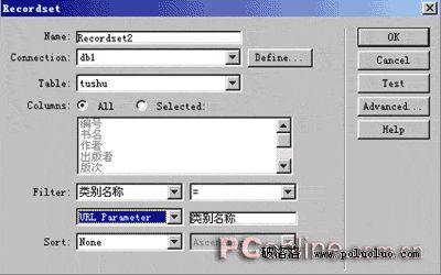 圖14 (2)好,URL Parameter已設置,現在再回到顯示網頁xianshi.asp來接受這個參數。選擇Recordset(Query),彈出Recordset對話框,在Filter中設置如上圖13,意思是:查詢條件為表tushu中的字段“類別名稱”要等於傳遞過來的URL Parameter參數“類別名稱”,這樣查詢網頁和顯示網頁就聯系起來了。