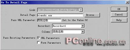 (1)先讓我們回到查詢頁chaxun.asp。用鼠標選中表格中的字段,再選擇Application面板上Server Behaviors標簽,按加號按鈕,選擇Go To Detail Page(到細節頁),彈出Go To Detail Page對話框,具體設置如圖14。Detail Page就是我們的顯示網頁xianshi.asp,Pass URL Parameter文本框裡輸入的就是要通過URL傳遞到細節頁中的參數名,為便於理解,我們輸入“類別名稱”,這個名字可要和後面顯示網頁裡設置的參數名一樣。Recordset意為從哪個記錄集裡傳遞出去的,我們選擇Recorset1,Column意思為URL參數值的來源,要與查詢網頁上的查詢條件一致,因此選擇“類別名稱”,Pass Existing Parameters這兩個選項於表單有關,而在這個查詢網頁上並沒有用到表單,因此可以不選。點擊ok按鈕,大家可以看到表格中的字段已變成一個包含動態內容的超文本連接了。
