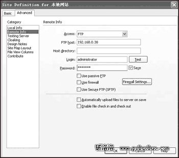 第三步 進制在窗口左部選取“Remote Info”一項,接著在右部區域中輸入申請空間的時候得到的遠程FTP站點傳輸類型(一般為FTP)、遠程服務器存放文件路徑、主機地址、用戶名和口令等信息。同時還要根據站點的傳輸模式來選擇是否采用“Use passive FTP”一項,這是因為部分FTP站點采用被動工作模式,對於這部分站點就要選取該項(如圖1)。