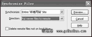 第二步 在輔助面板運行“Site→Synchronize”命令,此時可以看見圖3所示的對話框。首先在“Synchroniz”下拉菜單中選擇整個網站還是選中的文件,接著從“Direction”下拉列表中選擇“Put newer files to romote”一項,這樣可以由Dreamweaver MX 2004自動尋找本地文件夾中更新過的文件上傳到遠程服務器中。
