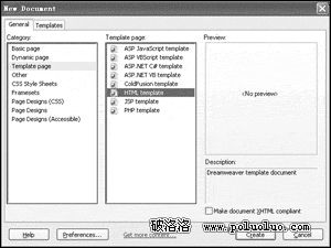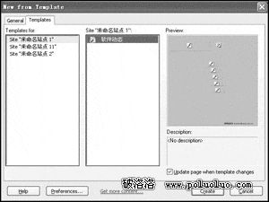 有了模板之後,接下來就要在編輯網頁時候使用它們了。只要在Dreamweaver MX 2004主窗口中運行“File→New”命令即可看見圖1所示的新建窗口,接著進入“Templates”標簽即可查看到已經保存的模板,從中選取一種還可以在右部的預覽區進行預覽(圖3),最後挑選一款中意的模板並點擊下部“Create”按鈕打開這個模板。