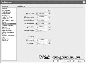 在打開的模板中,無法編輯的區域將呈高亮狀態顯示,但是有些位置是鎖定區域,卻不是高亮顯示,這主要是因為圖片正好蓋住了背景的顏色。對於這種情況,可以運行“Edit→Preferences”命令,在彈出窗口的“Category”列表中選取“Highlighting”一項,接著在右部區域中選取“Locked regions”旁邊的“Show”選項(圖4),並且設定高亮顯示色為藍色,這樣就可以很清楚地分辨出模板中的鎖定區域了。
