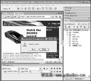 在通過模板創建了若干個頁面之後,如果需要更改頁面或者增加欄目,再對所有的頁面手工修改則非常麻煩,因此我們可以通過Dreamweaver MX 2004的模板修改功能來解決這個問題。比如我們對模板進行了修改之後,運行“File→Save”命令來保存模板,這時候會彈出提示框詢問是否更新所有使用了該模板的頁面(圖5),確認之後就會顯示出更新的頁面總數以及更新的時間等信息。