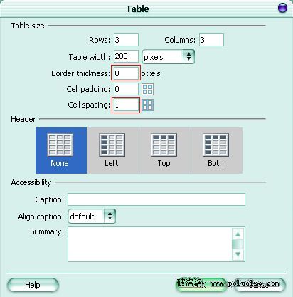 1.在Dreamweaver中按Ctrl+Alt+T,彈出插入表格的對話框,參數設置如圖(帶紅框項為固定值,否則無效果):