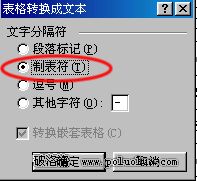 1、將表格轉換成文本。把Word XP文件中表格之外的文字全部刪除,只保留表格,單擊“表格/轉換/表格轉換成文本”,在“表格轉換成文本”對話框中“文字分隔符”選擇“制表符”,如圖所示。