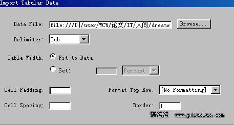 3、把文本文件導入到Dreamweaver MX中。在Dreamweaver MX編輯窗口中單擊“Insert/Table Objects/Import Tabular Data...”,打開“Import Tabular Data”對話框,如圖所示。在對話框中單擊“Browse...”按鈕,找到要導入的TXT文件,雙擊此文件填加到Data File欄中。其它選項可采用默認設置。單擊“OK”按鈕,Word XP文件中數據被導入到Dreamweaver MX。