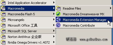 第一步,確定你安裝有Macromedia Extension Manager(以下簡稱EM),中文名稱就叫插件管理器,Dreamweaver 4.0以上版本都自帶了這個軟件,在安裝Dreamweaver的時候會自動安裝這個東東。如下圖所示: