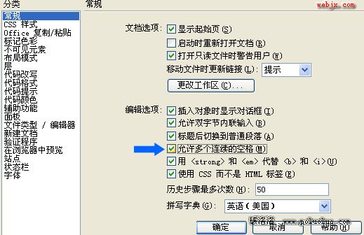 (1)在編輯網頁的時候,有時根據排版要求或其它原因需要輸入空格,DW MX 2004提 供了對 中文輸入的最好的支持。首先進行一下設置:點“編輯”菜單-->>“首選參數”-->>“常規”,勾選“允許多個連續的空格”。如下圖: