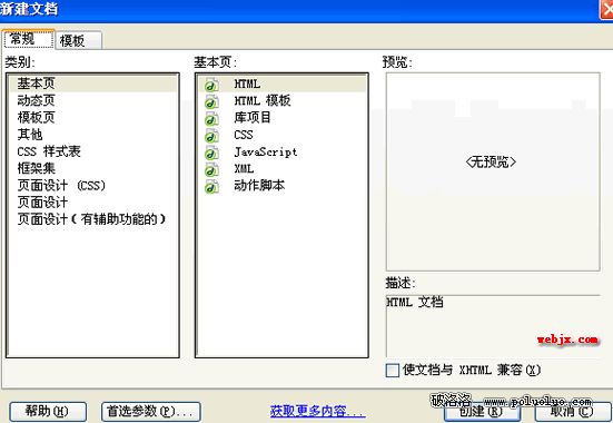下面我們開始介紹如何創建一個新的網頁,可以選擇“文件”>“新建”,彈出如下對 話框: