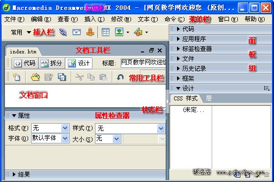 Dreamweaver MX 2004提供了一個將全部元素置於一個窗口中的集成布局。在集成的工作區中,全部窗口和面板都被集成到一個應用程序窗口中。(如下圖)