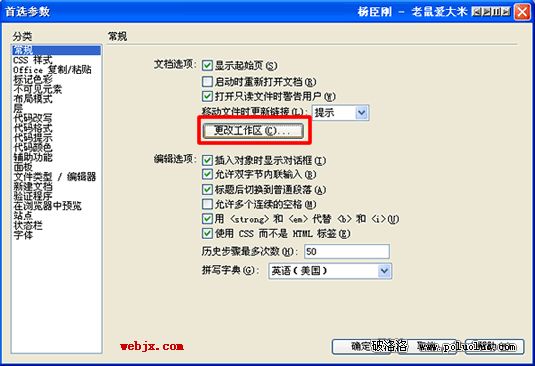 然後在出現的對話中可以切換到另一種不同的工作區。“編輯”菜單“首選參數”對話框如下圖: