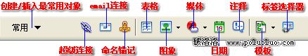 插入欄(如下圖):包含用於將各種類型的“對象”(如圖像、表格和層)插入到文檔中的按鈕。每個對象都是一段 HTML 代碼,允許您在插入它時設置不同的屬性。例如,您可以通過單擊“插入”欄中的“表格”按鈕插入一個表格。也可以不使用“插入”欄而使用“插入”菜單插入對象。