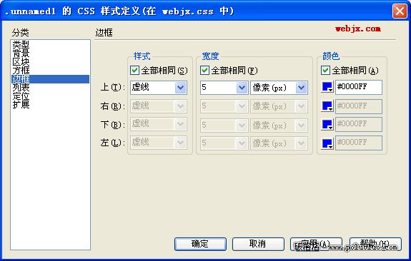 樣式:設置邊框的樣式外觀。樣式的顯示方式取決於浏覽器。DW MX 2004在“文檔”窗口中將所有樣式呈現為實線。兩種浏覽器都支持樣式屬性。取消選擇“全部相同”可設置元素各個邊的邊框樣式。