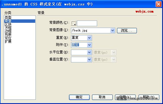 在“CSS 樣式定義”對話框中,選擇“背景”(如下圖),然後設置所需的樣式屬性。